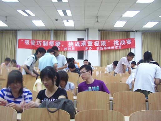 此次比赛分东、西两个校区同时进行,要求参与者每三人一组,每组同学利用社团提供的定量吸管和铁丝现场限时间制作桥梁,通过测试桥梁的载重能力进行评比,选出最优秀的若干组进入决赛。比赛一开始,同学们就利用手中的吸管和铁丝开始进行设计,三个人分工明确,利用课堂上所学到的相关知识力求桥梁形式美观,承载能力强。比赛现场气氛十分活跃,各参赛队伍苦思冥想、巧施妙计,充分运用各学科知识,大胆动手实践,设计出的桥梁形式各异。最后,各参赛队伍将成果进行展示,最终选出12支队伍进入决赛。