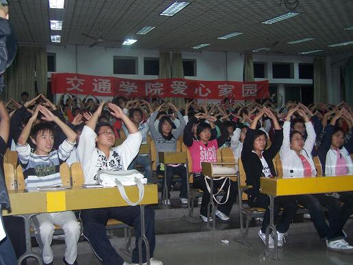 在一首<<感恩的心>>的伴奏下,活动拉开了帷幕。首先,刘冰冰就本社团的基本情况作了相关介绍。紧接着魏星向同学们做了《感恩的心》手语示范,同学们也按捺不住自己激动的心情,也都积极主动的模仿起来。在魏星细致认真的讲解和娴熟动作的展示下,充学员们很快就学会了基本动作要领。在他们美妙的手势中,向世界传达了他们那份充满爱的信念。让关爱成为一种习惯,离我们已不再遥远。最后,魏星又给学员们示范了日常生活中的常用的手语,现场气氛温馨而活跃。活动在同学们共同表演祝福祖国母亲生日快乐的手语中结束。