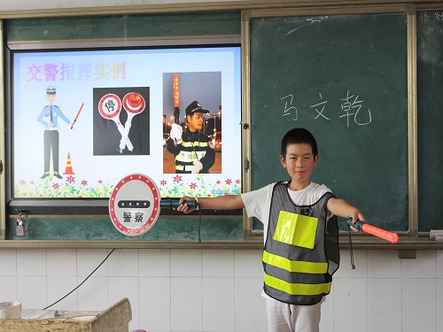 最后,为巩固孩子们对交通安全知识的掌握,马文乾为孩子们穿戴上了前期准备好的交警指挥器械,并合影留念。
