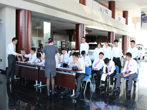 销售经理王亚男主持此次考核。她介绍道,此次考核分为才艺展示和模拟汽车销售流程两部分。才艺展示使各位待考核实习生在紧张的气氛下得以放松的同时也能展现个人精神面貌,便于各位考官更好的了解各位考生的性格。而模拟汽车销售流程则是对各实习生日常学习成果的检验,使考官判断其能否在日后真正接待客户时掌握各项基本技能以胜任汽车销售顾问的职位。