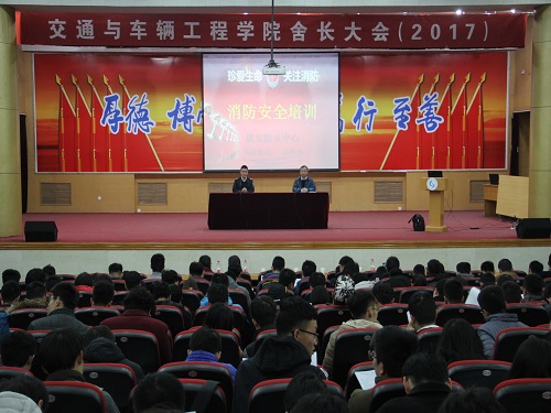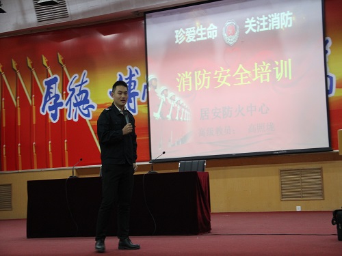 会议分为两个阶段,首先由高照垅教官为与会人员进行消防培训。高照垅讲述了地震、火灾发生的基本环节,说明了不同情况下的逃生方法及保护措施。他重点讲解了火灾来临时的应对措施,他讲到,现在所有公司的教学楼,宿舍楼以及校外大部分公共场所都配备有消防设施,当火灾来临时,沉着冷静的使用应急设施是最有效的逃生方法,不能盲目随众。高照垅现场演示了湿毛巾,防烟面具,救生锤及两种常见灭火器的使用方法,他告诫现场同学面对火灾时要把握好每一分每一秒,不要惊慌失措。最后他说明了宿舍常见的几种危险隐患及逃生方法,呼吁现场同学在宿舍做好安全防护措施。