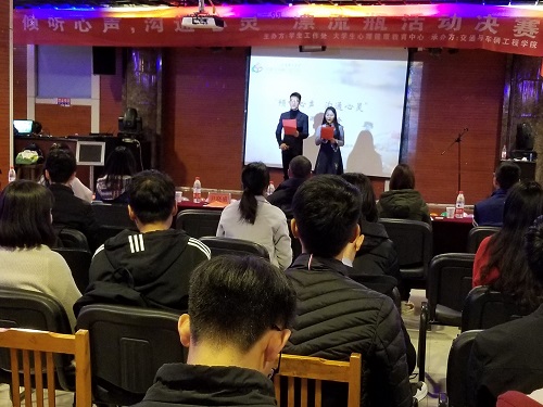 在一首开场歌曲后活动正式开始,主持人首先对出席活动的教师进行介绍。在宣读了评分标准与评奖标准之后,比赛正式开始。比赛分为上下半场进行,选手根据事先安排的顺序依次表演。参赛者们都在赛前做了充分的准备,用真情讲述着自己的心灵感悟。在上半场中,来自化学化工公司的三号选手,选择以演讲的方式,讲述自己自上大学以来自己的心路历程,从曾经的迷茫低落、多次与机遇失之交臂,到现在的抓住机会、自我历练,再到对未来充满向往,层层递进,最后以一句“我已经改变了很多,我相信,在未来的日子里,我会变得更好。”结束演讲。最终演讲以结构分明,感情真挚,获得全场最高分。在滕亮与观众进行短暂互动后,下半场比赛正式开始。选手们各展其能,别出心裁。七号选手将手语操与街舞结合在一起,节目以其强烈的律动性赢得观众的连连掌声。随后出场的十一号选手将目光对准抑郁症患者,并展示了自编自导的微电影《一个人》。影片以校园生活为背景,通过黑白色调表现出抑郁症患者的内心活动。比赛会场秩序井然,台上选手竞争激烈,台下观众热情高涨。