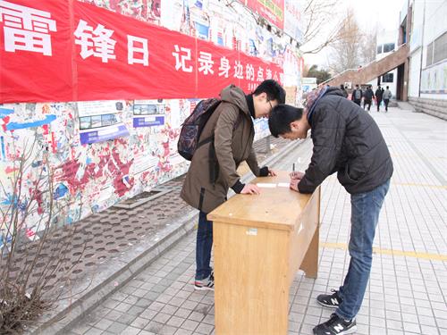为深入贯彻落实党的十八届三中全会及全国未成年人思想道德建设电视电话会议的先进精神,落实以立德树人为根本任务,3月5日雷锋日,青年助残协会在第三餐厅门口开展“记录点滴小事”学雷锋主题活动。以雷锋精神为楷模,深刻铭记和践行社会主义核心价值观基本内容,将雷锋精神内化于心、外化于行,努力成为新时代雷锋精神的传播者、弘扬和践行者。