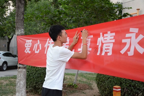 与此同时,在博大花园与9号宿舍楼下的校内定点募捐也如期进行。募捐形式较为多样,捐赠者可以将留言以便利贴形式附在捐赠品内,在条幅上签名并拍照留念。捐赠者在捐赠过程结束后还可以获得由实践团定制的带有“爱之传承”的纪念品。新颖的募捐模式吸引了众多同学,调动了捐赠者的积极性,纷纷进行捐赠。