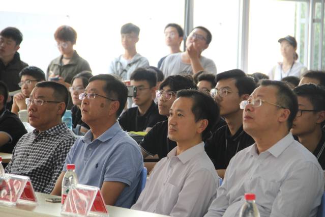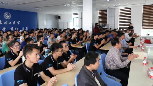车队队长王西洋同学介绍了新车的制造和参赛的筹备情况。他指出,车队始终秉持“厚德、博学、笃行、至善”的校训,不断传承发展,在专业技术、车队文化、团队建设等方面逐步走向成熟。今年是车队第四次参加全国大赛,2018年第四代赛车整个造车过程历时十个月,是具有突破性的一辆赛车,整体设计主要围绕着轻量化、动力性、燃油经济性三方面进行全面提升,整车设计亮点包括数据采集系统、碳纤维悬架、主动尾翼和自动升档。轻量化设计方面,整车质量从2017赛季的252kg降到了223kg,其中动力总成降低了10.2kg,减少了16%,车身车架降低了12kg,减少了21%,底盘降低了9.8kg,减少了8%。悬架系统的横臂由去年的钢材料变为碳纤维材料,实现全碳纤维悬架系统,半轴由去年的40Gr材料变为钛合金材料,所有的轻量化设计都是基于大量的CAE仿真、实验、工程实践经验。在动力性方面,通过MoTec代替原车ECU,通过MATLAB拟合发动机万有特性曲线以及外特性曲线,设计自动换挡,最大限度精确换挡时间,同时,通过自制进排气、油箱、冷却系统,保证发动机在限流后有一个最佳工况,实现实车75米直线加速用时4.2秒。在电控系统方面,使用Due作为主控芯片,采集发动机数据指导底盘性能调校及整车性能优化,并将重要数据显示在串口液晶屏上,同时采用自动可变尾翼系统,减少车手操控难度。