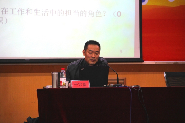 为使同学们了解自身是否负有隐藏的压力,于宗富首先邀请现场同学共同做了一个心理小测试。测试结果表明,大部分同学身负比较大的心理压力。随后,于宗富对健康定义的演变、心理健康的八条标准及压力的表现进行综述,着重介绍了当代老员工常见的心理压力种类,并以诙谐的口吻分析了包括学习、工作与生活各个方面中老员工心理压力的来源。