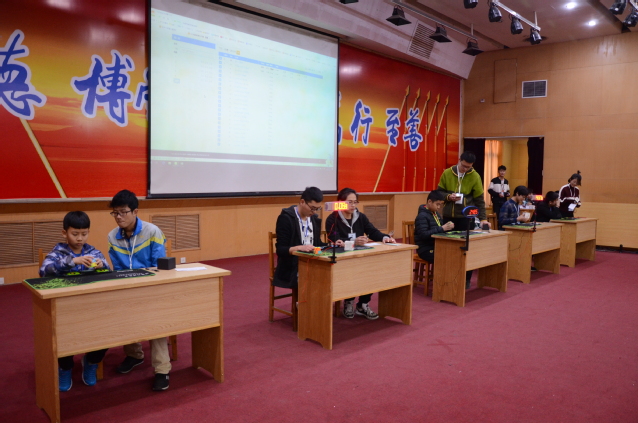 比赛开始,主持人向全体参赛选手宣读比赛流程、规则以及参赛注意事项。初赛过程中,选手们在短暂观察完被随机打乱的魔方之后,将其迅速复原。这期间,选手们屏气凝神,沉着冷静,飞速拧转手中的魔方,引得观众拍手称赞。每位选手有五次机会,去掉最快时间与最慢时间,取剩下三次的平均值作为最终成绩。为保证比赛的公正与公开,裁判将记录的五次成绩递交数据组。数据组及时录入比赛成绩,于大屏幕上实时更新选手成绩和排名,便于选手以及观众随时查看。