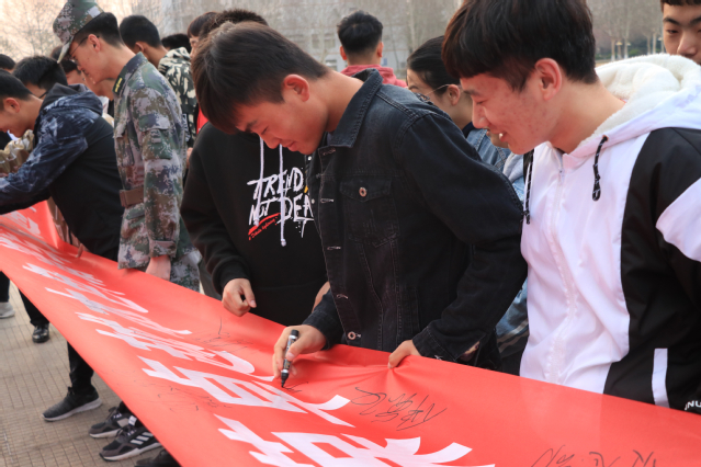升旗仪式结束后,现场师生在条幅上写下誓言承诺和对祖国的美好祝愿与期望。