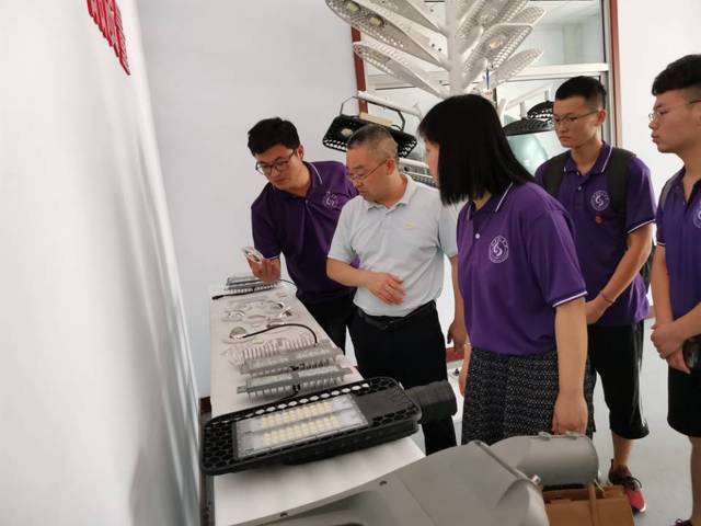 7月14日下午,bevictor伟德“慧灯淄博”调研实践团一行12人赴山东凯创光电科技有限公司及凯创智慧城市设施有限公司进行暑期社会实践调研,总经理于明岳亲自带领同学们参观,并简要介绍了凯创企业的LED路灯,智能电子站牌及智慧交通管理系统等项目,耐心回答了同学们的问题。同学们首先参观了LED灯具生产车间、样品展厅、检测实验室,了解了凯创企业新研发的经济型LED路灯,LED模组灯具,智能感应控制LED路灯。团队成员王斌就控制方式以及智能化带来的便捷等问题进行提问,总经理于明岳提到凯创光电公司研发的远程控制系统可以通过电脑、手机、平板等终端,实时查看路灯亮灯情况,如有损坏,及时安排人员处理,也可以根据夜间不同时间设定不同的亮灯范围、亮度,进行人为控制,大大节省了巡线人员的时间、精力,也节省了电力。