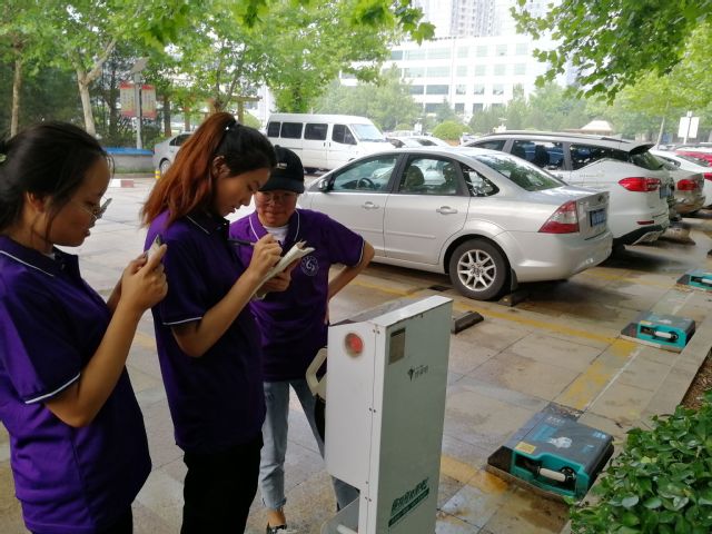 A组成员到达后,第一时间与制造园中的相关工作人员进行沟通了解,该组成员对特来电充电站(淄博先进制造园)中的充电桩的数量、性能参数、收费标准、使用率进行了统计,并且向工作人员收集了日营业额使用率、故障率等数据,且做好数据备份。由于该处充电桩地处偏僻,车流量相对较少,时间团A组成员未能碰到使用充电桩的用户,推测此处充电桩使用率偏低。最后,A组成员于特来电充电桩(淄博先进制造园)充电站前合影留念,简单休整后便全体返回公司。