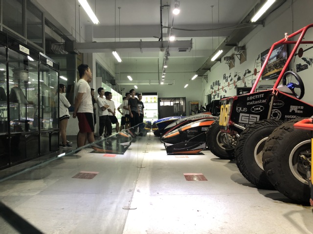 实践团队在队长的带领下,到达HRT车队所在的创新实验楼,实践团成员参观了HRT车队过往赛季的赛车,对其赛车结构及用材进行深入分析,其悬架部分采用的是国内最先进的材料,车身材料精细,运营组成员于炳浩虚心像大三学姐请教运营技巧,双方讨论今年的成本设计报告以及营销报告。经过比较两校车队的差距,公司车队仍有很多地方需要改进,悬架组、传动组、转向组、车身车架组组长之间互相交流,将对今年的赛车进行一定的改进。