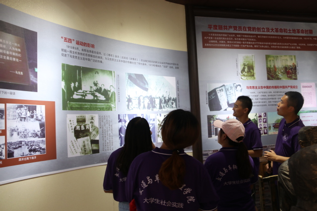 进入文化馆内部,屏风展览着平度市革命历史及新中国成立后旧店镇人民社会主义事业奋斗史。文化馆向导向实践团讲述了旧店镇对平度市革命的重要作用,展馆内通过雕塑真实再现了平度市第一次代表大会的情景。