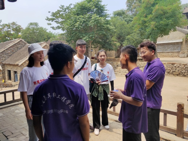 最后,成员们在导游的带领下参观沂蒙红色革命影视基地暨山东省党员党性教育基地,参观红嫂故居,在导游的讲解下深入了解了这些抗战女英雄的抗战故事。当地的导游也热情地向成员们介绍基地的建设情况,并结合历史资料,讲述了发生在这里的许多抗战传奇。在参观过程中,实践团遇到临沂大学教育公司红色班,两方团队成员进行了红色精神传承、社会实践经验等方面的交流分享。