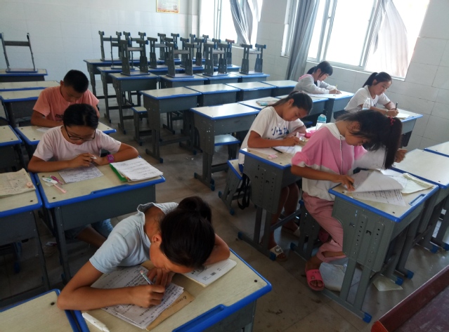 在支教活动中期,支教团对于员工们的学习情况针对性的出了考试试卷,决定于7月31日进行年级考试,在年级考试中针对六年级考生进行无人监考考试模式。在六年级的无人监考考试过程中,每名员工都很自律,员工们严守考场纪律完成了整个期中考试。放学后支教团老师们拿着厚厚的卷子回到宿舍进行阅卷。经过半个月的教学,期中考试即使对孩子们的一场考试也是对支教团的一个教学检验。支教团的每个成员都希望通过支教活动,通过自身的努力小心呵护,可以让支教之树结出红红的果实,孕育出希望之星。