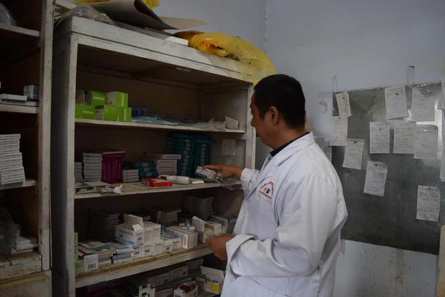 实践团成员到达胡明华诊所的时候,胡医生正在给病人开药,窄小的医药房虽然简陋,但是所有的药品都井井有条地放置,墙上贴满了形形色色的药单。
