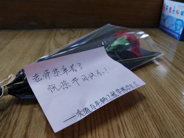 教师节的课堂上,公司员工早早把讲台打扫干净,准备为老师们送上一份特别的祝福,他们将精心准备的一张爱心卡片和一支鲜花摆在讲台,安静的等待老师走进教室。卡片虽小,却充满着员工对老师的尊敬与感激之情。员工在黑板上写下祝福语,主动起立齐声祝老师节日快乐,以此表达对老师的崇敬之心。