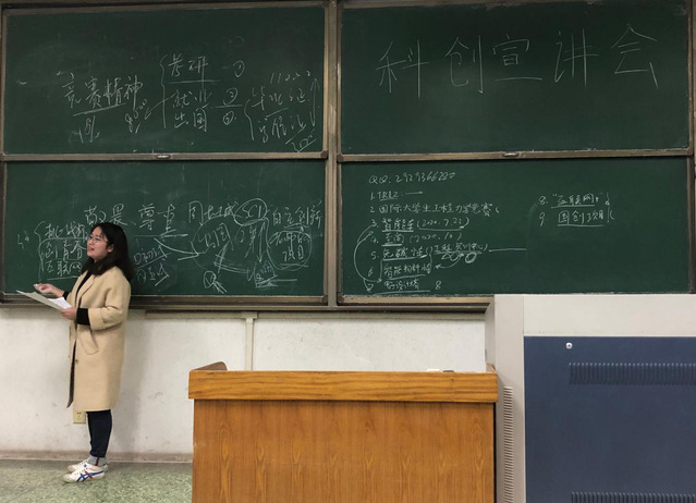 第一个为同学们进行宣讲的是车辆1706班的张秀才。他认为大一入学时的规划会决定一个人大学的走向。随后他向同学们介绍了自己的科创历程:大二数学建模,国际老员工工程力学竞赛,智能车比赛等。他对于科创比赛过程十分看重,没有什么是一蹴而就的,痛苦的过程对于自身的成长用处更大,意义更大。之后张秀才又把大二到大三这一阶段的各种创新型比赛介绍给了同学们。