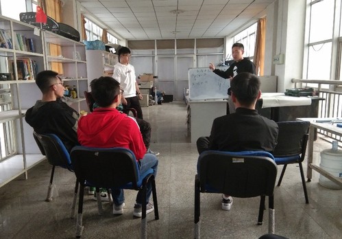 随后,刘科岳在郭海溢的绘图帮助下讲解了动态赛比赛项目:75M直线加速,八字环绕,高速避障与耐久赛四种不同赛道下车手们应该注意的问题,并分享了自己在面对这些问题时的经验。