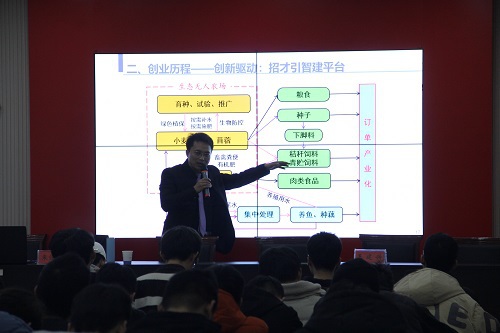 此次讲座的题目是“朱俊科,一个不乐意当农民的当代农民”,朱俊科以电影《大话西游》为切入点,结合自身创业历程,向在座的同学们生动地讲述了自己跌入低谷并重新获得成功的故事,并为在未来有创业意愿的同学提出自己的宝贵建议。
