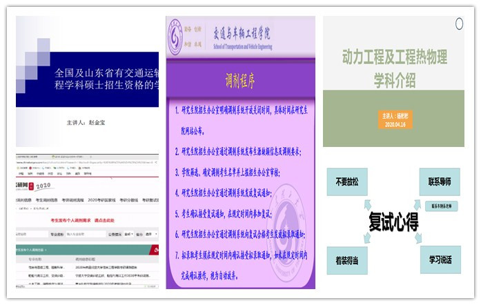 交通运输系教师赵金宝、交通工程系副教授郭栋、能源与动力系教师杨彬彬、车辆工程系教师付宏勋4位老师分别进行了讲解。赵金宝主要讲解了省内外交通运输专业有硕士招生资格的院校的招生资格、学科实力、调剂难度,避免毕业生在调节剂过程中踩雷。郭栋叮嘱考研员工要在复试过程中着重体现自身的创新能力,建议毕业生可以从学术生涯规划的角度考虑跨学科调剂,拓展专业调剂的维度。杨彬彬从学科概况、研究方向、团队队伍、科研条件、人才培养5个方面系统介绍了公司动力工程级工程热物理的学科情况,并欢迎考生积极调剂本校。付宏勋从当前考研分数段入手,分别给予了毕业生中肯的建议,并具体讲解了复试备考、面试过程中的注意事项。
