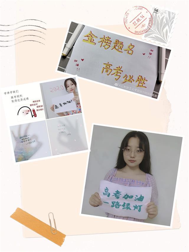 受疫情影响,2020年高考推迟一个月,所以今年考生面临着前所未有的挑战。在高考来临之际,交运1903班开展了以“助力高考,我们在行动”为主题的团日活动。班级同学积极参与,通过写贺卡,录视频,拍图片等多种方式,给今年高考的莘莘学子们加油助力,祝福他们能取得理想的成绩并实现自己的梦想。陈旭杰还参与到为高中母校的学弟学妹录制加油视频的活动中去,为即将参加高考的同学加油打气。其他同学也制作了精美的贺卡,鼓励考生们高考加油,勇争前排,纷纷为高考学子送上真挚的祝福,希望学弟学妹们能够旗开得胜,金榜题名,取得不错的成绩。活动最后,班级同学纷纷表示期待高考学子们能够执笔为帆、乘风破浪、书写青春的答卷。
