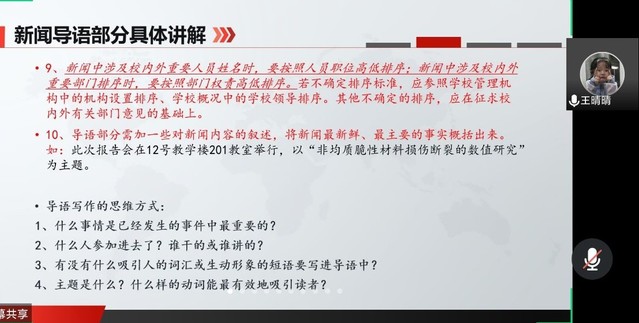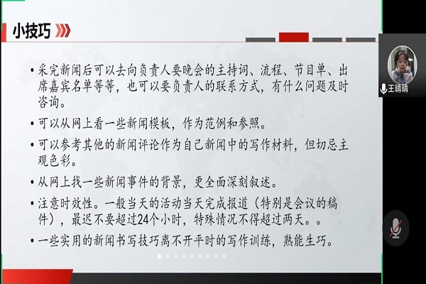 首先,王晴晴围绕新闻基本知识、新闻书写详解、新闻照片拍摄和选用、投稿具体流程四个方面展开讲解。