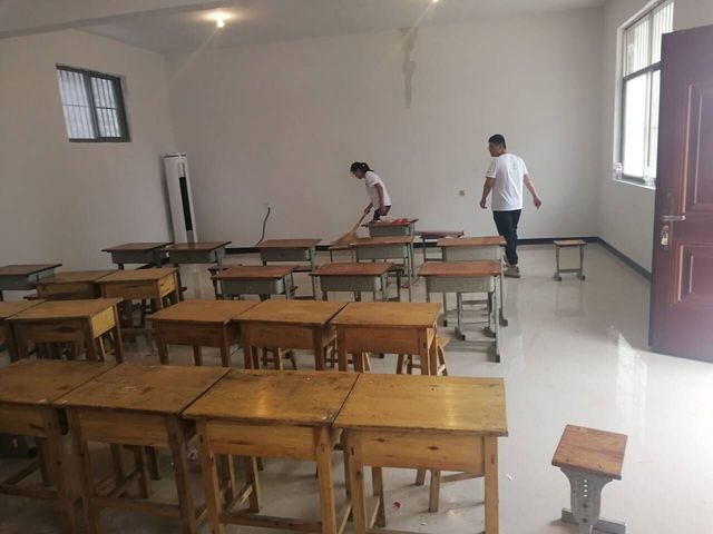 7月16日上午团队成员陆续到达巨野县田庄镇,下午他们在教室内布置环境,做好教室的消毒工作,为明天开课做好准备。招生工作此前已由大队协助完成。