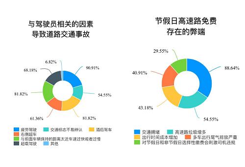 根据表单显示,公众大部分选择高速出行的原因是旅行或外出工作,两种情况占比均达到45%,绝大多数公众认为,造成高速路交通事故驾驶员方面的因素在于酒后驾车或不能保持适当的车速和车距,两种情况占比均达到81.82%。针对以上问题,小组分析出解决的措施有,适当在寒暑假及其他节假日期间限制高速客流,以减轻高速路承载负担,并在部分复杂路段适当增加限速,并严格查处酒后驾驶。