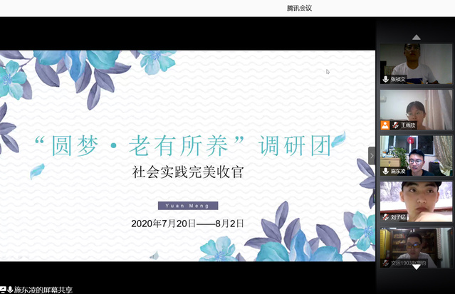 为总结暑期社会实践的调研过程,进一步开展后期整理工作。8月2日晚,“圆梦”实践团通过腾讯会议平台召开线上活动收官会议,队长施东凌主持此次会议,实践团全体成员共同参加。经过12天线上线下相结合的调研活动,由公司17名同学组成的“圆梦·老有所养”社会实践调研团以“养老模式”为主题的调研活动圆满结束。