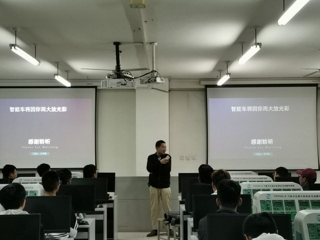 紧接着,智能车协会指导老师苗立东讲话,他首先表示欢迎新生能选择智能车协会这个大家庭,同时他也希望同学们能够注意实验室里的安全与搭建智能车时的安全注意事项,毕竟安全无小事,希望同学们能在保证安全的情况下发挥自己的特长,研究自己的兴趣,能在智能车协会发展的更加出色。最后,19级成员带领新成员们参观了智能车实验室,并向正在实验室搭建小车的同学们进行了介绍,实验室成员也对新成员的加入表示热烈的欢迎。
