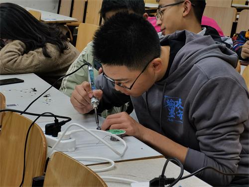 演示完毕后,比赛正式开始,规则为成功点亮小灯且用时最短的队伍获胜。各组同学回归座位,按照电路图组装元件,进行焊接。由于大部分参赛者是第一次接触焊锡,因此在焊接过程中出现了漏焊、电烙铁不挂锡、短路等问题。遇到问题的参赛者主动向社团干事请教,干事们观察了参赛者的焊接板,找到了他们的操作问题,并教授了焊接技巧。在干事们的指导下,参赛者不断改进焊接方法,摸索技巧。在所给元件焊接完毕后,各组将焊接板交给刘壮壮进行亮灯检测,若亮灯则完成比赛,否则将板拿回,继续改进直至亮灯为止。比赛完结后,有兴趣的参赛者,可以申请将自己的成品带走。