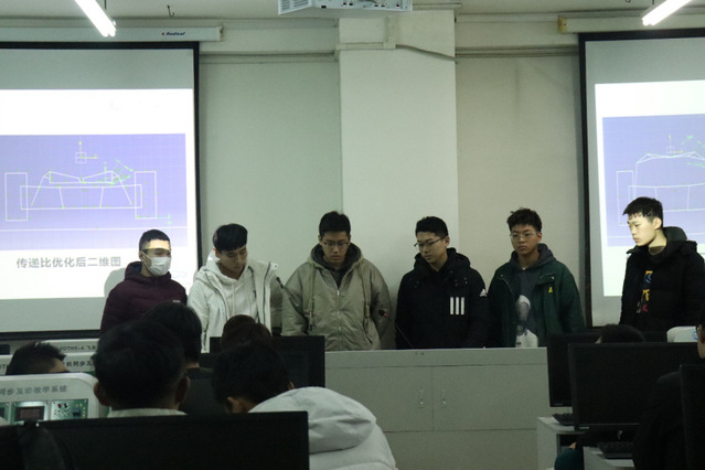 接下来,技术组各组队员分别介绍了本组的样车工作安排和设计思路。动力总成系统队员介绍了油箱位置·排气系统和机油泵;电控系统队员介绍了样车整车电路线束建模·单片机控制换挡模块·气动换挡结构和档位显示器及接线方式;悬架系统队员介绍了传动比的优化前后对比和传动比的计算;车身系统队员介绍了车架焊接顺序;转向系统队员介绍了方向盘设计·转向柱支座和转向机的轻量化设计;制动系统队员展示了实际图·仿真图和实物图,并进行了介绍;传动系统队员介绍了条状槽和差速器的固定方式。在答辩过程中各评委指出了设计过程中需注意的问题,同时也提出了现存问题的解决建议。