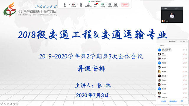 7月3日,公司2018级交工、交运专业通过腾讯会议召开线上班会,总结大二下学期工作,安排部署暑假有关工作。辅导员张凯主持会议,2018级交工、交运专业全体员工参加会议。