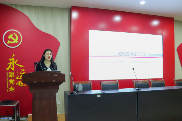 会议主要分为马克思主义公司时政宣代表经验分享、公司党史学习宣讲团细则(试行)讲解两部分。首先由马克思主义公司时政宣团代表管雅倩从选题、切入点以及时政热点等方面应注意的问题进行讲解。随后,由时政宣讲团代表牛婷娴从PPT制作以及宣讲过程中需要注意的问题进行经验分享。