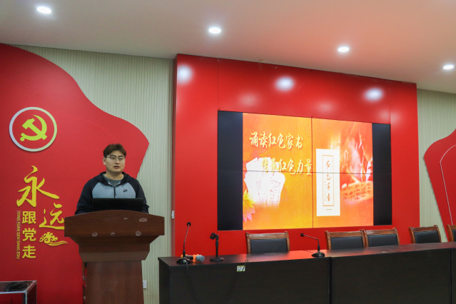 此次活动主题为“诵读红色家书,传承红色力量”。翟鲲鹏首先向大家详细地介绍了赵一曼、左权、夏明翰等革命先烈的英雄事迹,学习他们投笔从戎、甘洒热血的爱国精神。接着,他又饱含深情地为大家诵读了《赵一曼写给宁儿的一封信》,并抒发了自己的感受。他说,烽火连三月,家书抵万金。赵一曼先烈虽然离我们远去,但她的精神将永垂不朽,她的理想信念将永远地烙印在我们每个人的心中。作为新时代的青年,我们应当不忘初心、铭记历史、牢记使命、担当作为。