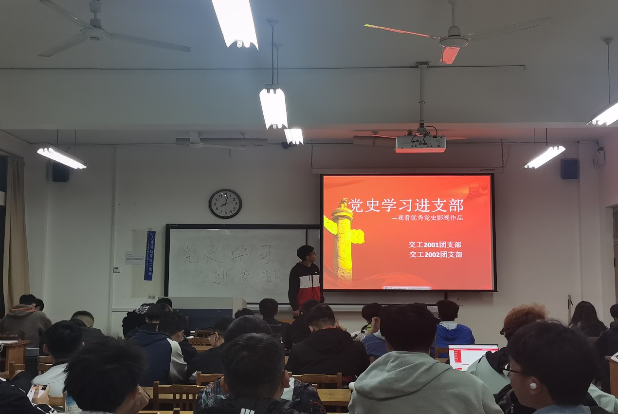 2021年4月15日晚,交工2002团支部全体成员于12教210开展“党史教育进支部”优秀党史主题教育影视作品欣赏。团支部成员认真观看,深刻学习党史理念。