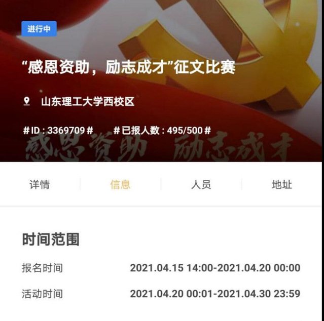 活动自本月上旬开始筹备,活动初期通过班委宣传,在餐厅门口发放宣传单等途径获得了全校各公司许多同学的关注,参与活动人数近五百人。活动自4月15日开始到4月25日结束作品收集。长达十天的作品筹备时间,让参赛同学的感想得以充分酝酿,并且化作纸张上感人故事。这些故事写满了各色受助同学在相对困难的环境中刻苦求学,砥砺奋进,即使身处陋室也不忘书香为伴的精神。