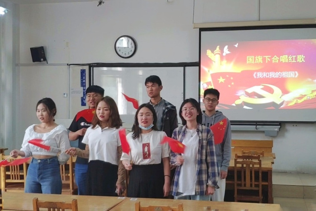 此次活动由支部成员赵菁、王雨欣组织进行,首先赵菁向参与成员对活动背景及意义进行介绍,接着王雨欣向参与成员发放红旗并播放《我和我的祖国》伴奏,参与成员深情吟唱。活动结束后,支部成员进行积极交流,一起分享了更多更高质量的红色歌曲。