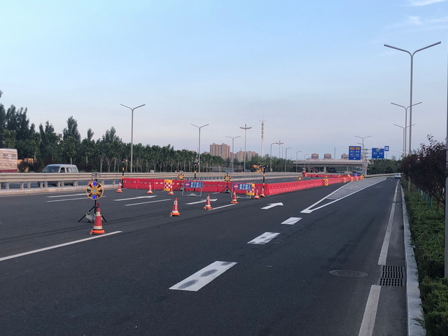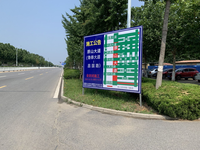 据了解,原山大道-鲁泰大道互通立交项目位于淄博中心城区西北侧,紧邻济青高速公路、滨莱高速公路。项目建成后,不仅将作为实现“高快一体”的衔接点,也将成为淄博市“内环”快速路网重要节点,对缓解主城区交通拥堵和促进经济社会发展具有强大推动作用。下午4时,实践团到达原山大道封闭施工路段,并对沿线路段的道路施工标志放置位置进行调查记录,发现在原山大道相邻路口,中润大道与济南路,中润大道与天津路,中润大道与上海路等均有多种图文施工标志,提醒过路车辆调整驾驶路线,引导车辆进入东西向的鲁泰大道,然后转到上海路、天津路等进行行驶。