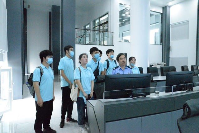 实践团到达目的地,在清点人数,确保每个人安全抵达后,实践团队长贾莹莹联系相关工作人员带领实践团进入合成警务指挥中心进行参观。