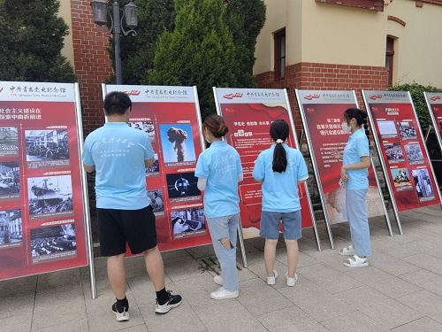 随后,社会实践队深入青岛党史纪念馆,对青岛党史进行了解学习。馆内陈列着众多党史历史文物,墙壁上印刻着历史性党史事件以及人物介绍。在此过程中,团队成员了解到青岛红色历史进程,感叹其蕴含的文化底蕴。团队成员在纪念馆中重温历史,接受革命传统教育,重温战火纷飞的峥嵘岁月,感悟革命精神,传承红色基因。