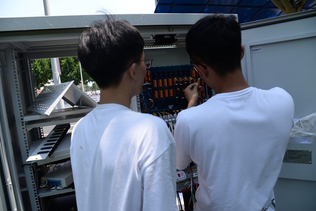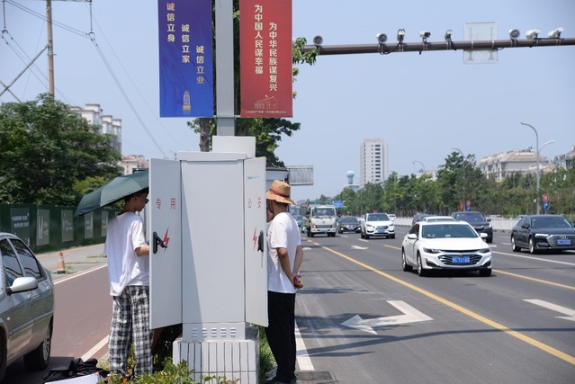 烈日炎炎,暑气正盛,实践团副队长杨秀峰来到金润大道与西六路交汇路口,协助工作人员在交通信号机上进行装置的安装与调试,汗水已经打湿衣襟,但没有熄灭完成本次调试的信心,最终在成员们的共同努力下,雷达对车流量的检测情况符合所需要求。随后实践团又分别来到金润大道与泰美路、世纪路交汇的两个路口,经过在信号机上安装网关与连接器和进行程序的调试,发现雷达安装存在一定问题,同时记录所存在的问题,将在调试完成后及时向相关技术人员进行反馈。