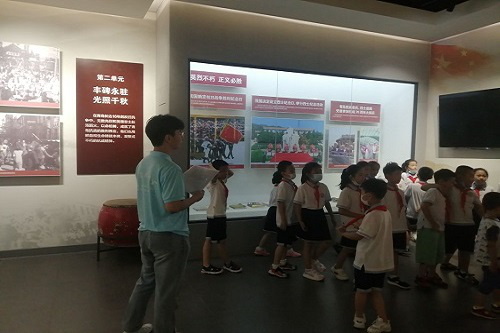 军魂馆以“破晓”为陈展主题,主要陈列抗战胜利后青岛党组织领导的地下斗争以及开展的护厂、护市、护校、反南迁英勇斗争及青即战役等内容。其中社会实践队成员为四方小学进行讲解各位烈士的光辉事迹,学习青岛英烈精神。
