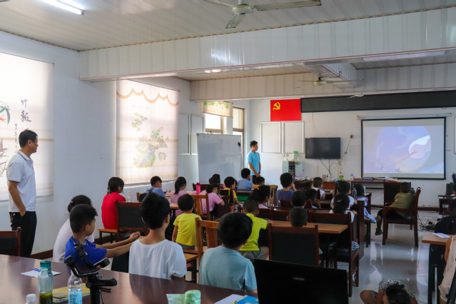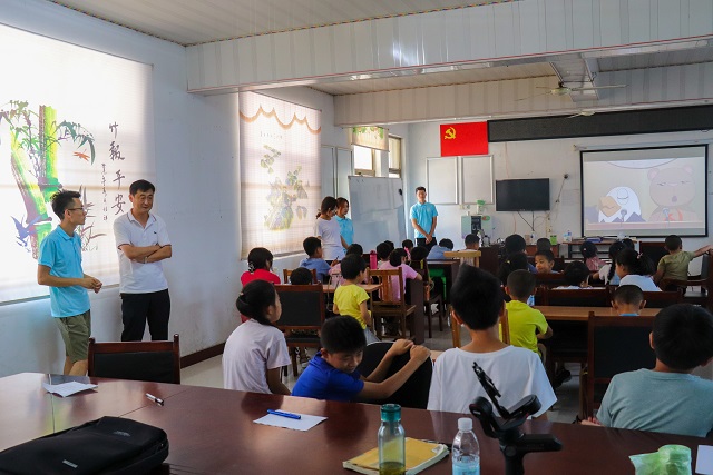 7月24日上午,柘沟镇党委书记李锐在柘沟镇柘沟三村党支部书记孙文田的带领下来到了柘沟镇柘沟三村村民委员会,旁听“圆梦·红色育人”社会实践团支教团队正在进行的红色教育主题课。