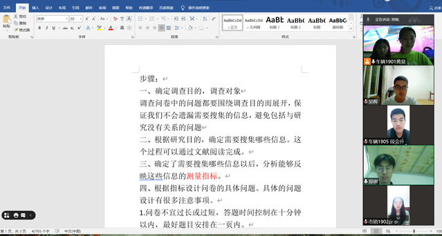 全体成员根据介绍的有关问卷要求展开讨论。队长贾莹莹首先提出确定问卷指标的问题,成员们积极发言,各抒己见,杨秀峰、黄昊等成员陆续提出采用车流量,行车速度,等待时长等作为调查指标的观点,获得成员们的一致赞同,并对其进行补充。随后,成员们开始对问题的设置方式进行讨论,并时刻注意避免出现过多主观性,引导性的问题。在成员们的共同努力下,最终确定了问卷格式及内容。