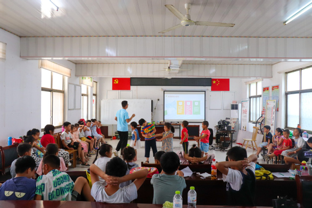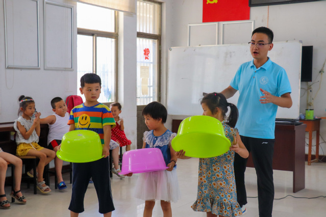 课堂上,孩子们认真听讲,大声朗读着自救小方法。在李晓龙的带领下,孩子们对洪水来临时的自救方法进行了演练,包括在水中用盆悬浮身体和用竖排搭肩膀的方式利用集体力量固定身体。在了解了洪涝灾害的巨大破坏性之后,孩子们都用稚嫩的语言向老师保证:暴雨天气一定会待在家里,不出门玩闹。最后,为让孩子们牢记防汛知识,实践团成员赵杨志用朗读防汛口诀的形式对课堂知识进行了总结,他带领孩子们大声朗读防汛口诀,巩固孩子们上课学习的知识。