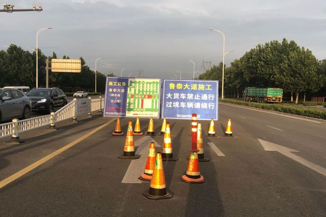 此次调查鲁泰大道,调查包括受影响周遭路口的红绿灯信号配时,交通流量组织,道路的全封闭施工情况等,团队成员前往封闭路段进行调研与考察,通过实地考察发现,在封闭期间,在可能通往该路口的各个路段都安放了“图文版道路施工标志”,为来往的车辆进行提示,在匝道封闭路段也安放了锥桶、水马等来对来往车辆进行视觉上的警示,仍留出两车道供车辆通行和行人经过。在路边也有“前方300米施工,请减速慢行”样式的警示牌提示车辆慢行调整行驶路线等。在调查过程中,道路通行较为良好,有排队拥堵情况出现,但并不严重,整体道路组织情况良好。