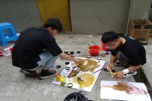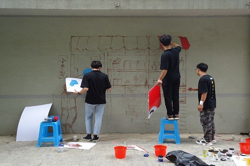 下午,史宇琪,陆金泽,宋道博等人率先到达实践地,开始对外墙墙绘进行细致刻画。他们做好分工,从调色开始,把墙绘图案进行分块,分组进行绘制,极大地提高了绘画速度。同时,刘黎昌,赵尊等人开始制作墙绘“闪闪的红星”的配件,利用当地废旧纸板,进行二次改造利用,制作配件。随后,尹欢欢来到实践地,与实践地对接后续物品的购买事项。并就台风天气问题,叮嘱实践团相关注意事项。她开车带领实践团部分成员前往商场,购买物资,以应对台风来临时可能出现的生活问题。