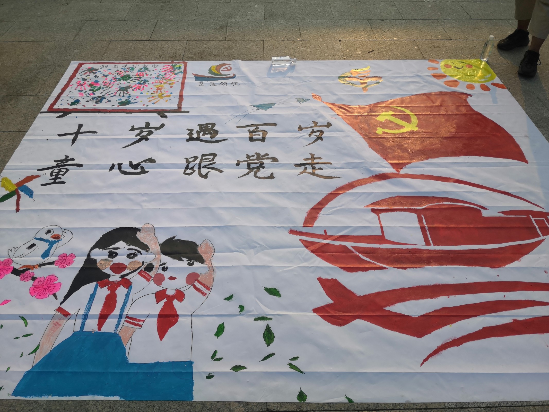 此次活动的绘画图案主要由党旗、红船、儿童、校徽、“十岁遇百岁,童心跟党走”十个大字及鳌山卫当地元素组成,突出表现了“童心向党”的核心主题。画布由实践团副队长房玉莹带领四名成员共同制作而成。