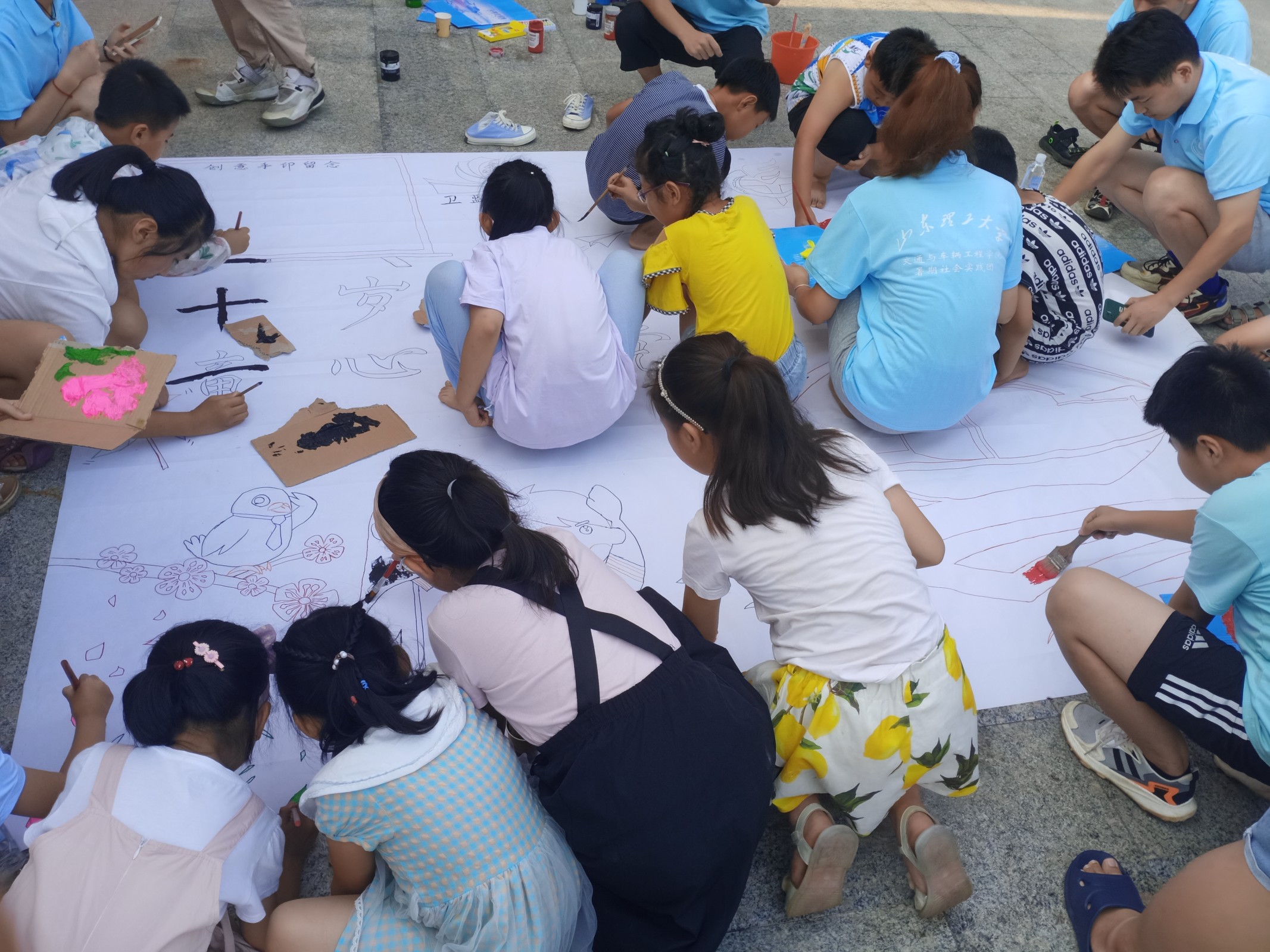 分两次把小朋友活动伊始,实践团把画布铺平,初光支教与环保宣讲团和家长带到活动场地。小朋友排好队,依次到实践团工作室前领取画笔和丙烯颜料。随后按照一个实践团成员带领三个小朋友的分工模式,开始分区域作画。作品由两组小朋友轮流完成,第一组小朋友对作品进行大规模的初步上色,填涂出作品的大致样式。20分钟之后,第二组小朋友继续作画,对画作进行细致刻画,查缺补漏,将作品的空白部分进行补涂。最后,小朋友在实践团的带领下,依次选择自己喜欢的颜料,在画布的“创意手印留念”处留下自己的手掌印。此次活动在小朋友的笑脸和家长的拍照声中圆满结束。